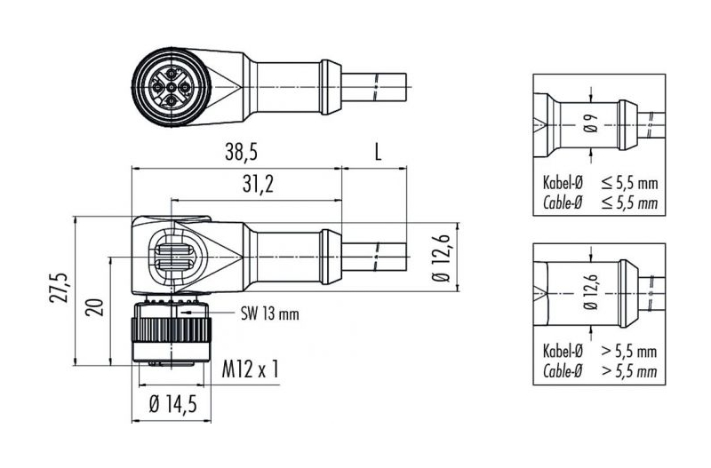 - Разъём с кабелем, контакты: 8, мама, Iном. = 2A, Uном. = 30V, замок: M12 Lock, длина кабеля: 5 м, сечение провода: 8x0,25 мм², степень защиты: IP69K.