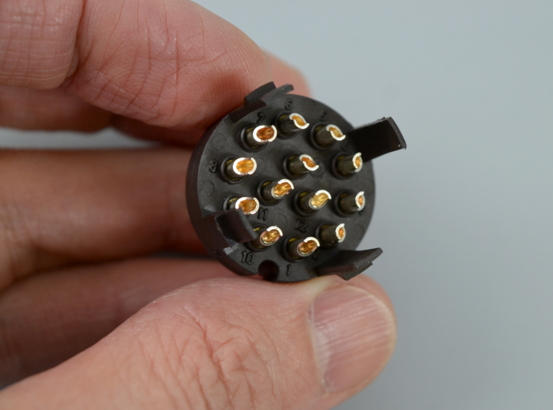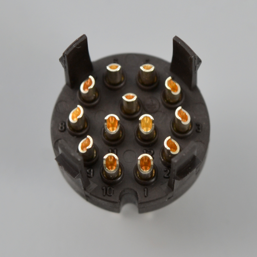 Контакты изготовлены из латуни и покрыты серебром, количество 13 на разъем, все под провод сечением 1,0 мм². Номинальный ток: 6 А. Номинальное напряжение составляет 250 В, номинальное импульсное напряжение 4000 В.